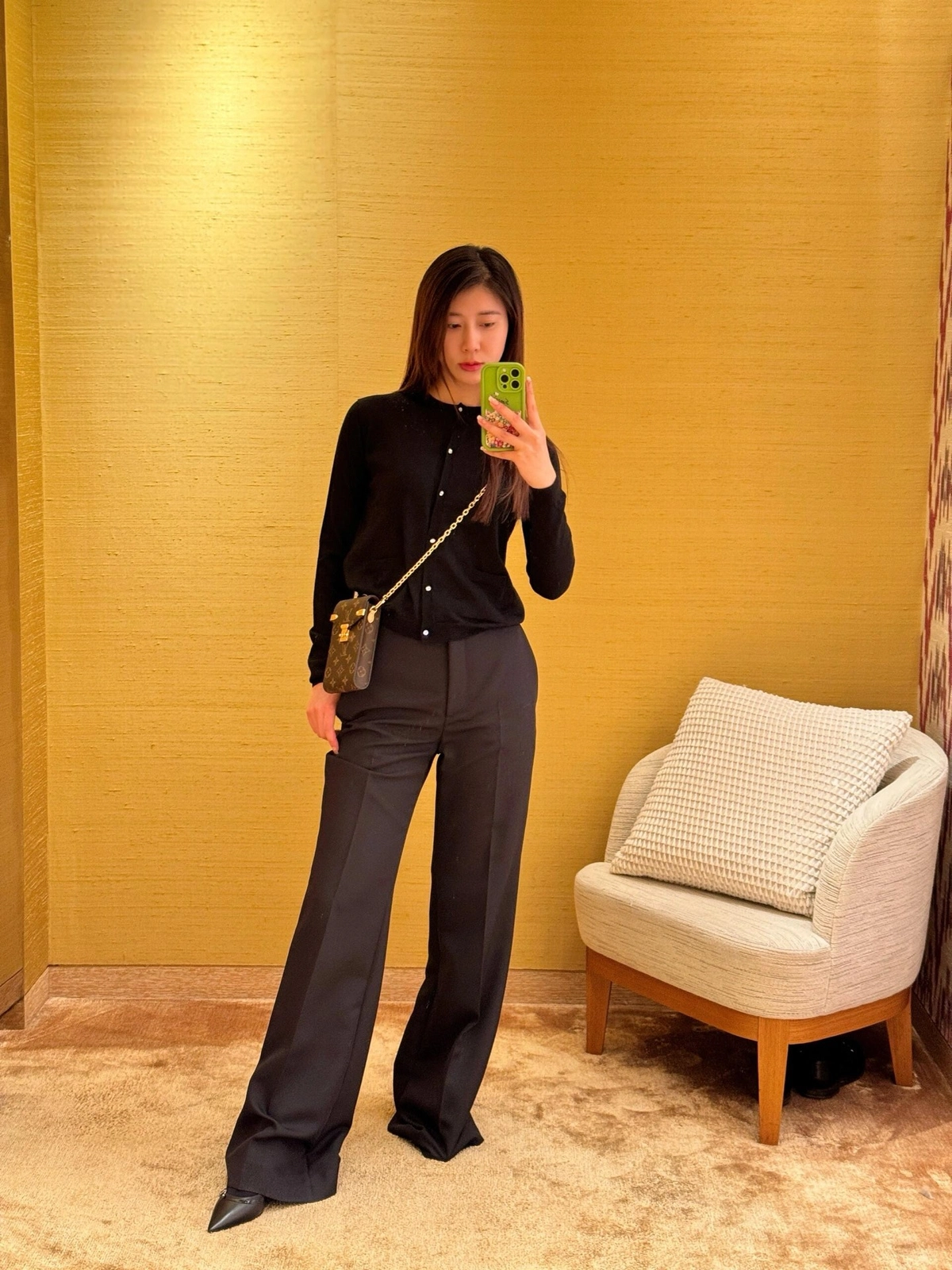 搭配剪裁俐落的西裝外套與高腰長褲,手提包款,展現專業又時尚的氣質。