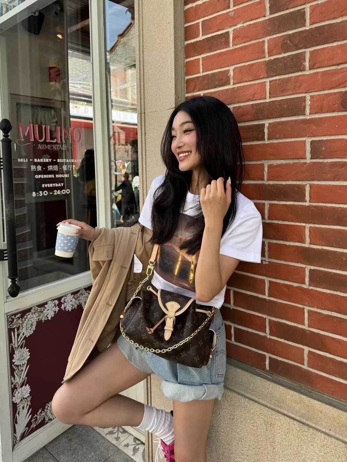 • 搭配白色T恤、牛仔褲與白色運動鞋,展現輕鬆日常風格。